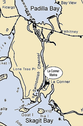 La Conner is located on the Swinomish Channel connecting Padilla Bay on the north with Skagit Bay on the south. The entrance to the marina is at 48° 24' 02.85" N, 122° 29' 46.83" W. |