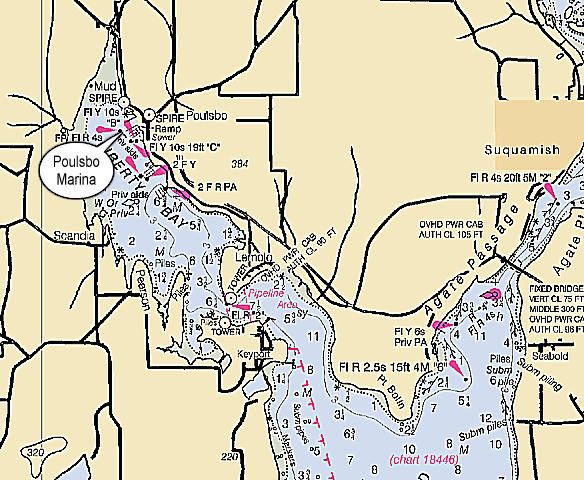 Poulsbo is located in Liberty Bay on the Kitsap Peninsula, approximatey 10.6 nautical miles, by air, north of Bremerton. The Marina entrance is at 47° 43' 57.78" N, 122° 38' 59.47" W.